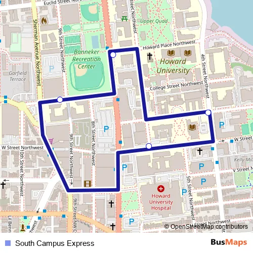 The first stop of the South Campus Express bus route is Georgia Ave & Howard Pl and the last stop is East Towers. South Campus Express (South Campus Express) is operational during entre semana.