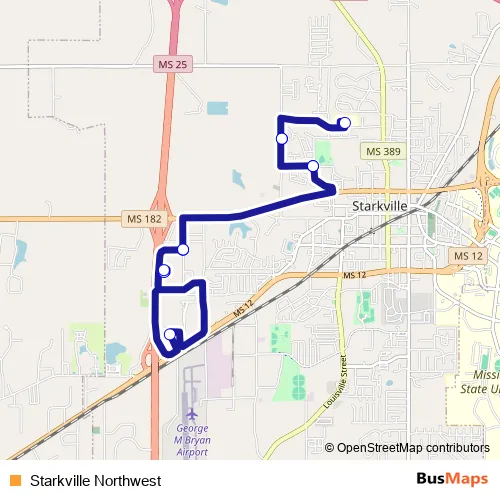 See why over 2 million users trust and consider busmaps.com as the best public transport website. busmaps gives you Starkville Buses suggested routes, real-time bus tracker, line route maps in Starkville, and helps to find the closest Starkville Northwest bus stops near you. No internet available? Download an offline PDF map and bus schedule for the Starkville Northwest bus to take on your trip.
