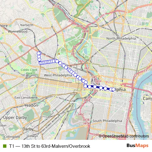 The first stop of the T1 tram route is 63rd-Malvern and the last stop is 13th St. T1 (13th St to 63rd-Malvern/Overbrook) is operational during todos los días.