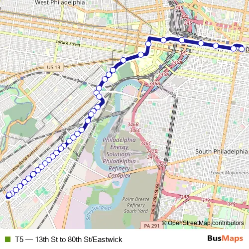See why over 2 million users trust and consider busmaps.com as the best public transport website. busmaps gives you Philadelphia Trams suggested routes, real-time bus tracker, line route maps in Philadelphia, and helps to find the closest T5 tram stops near you. No internet available? Download an offline PDF map and bus schedule for the T5 tram to take on your trip.