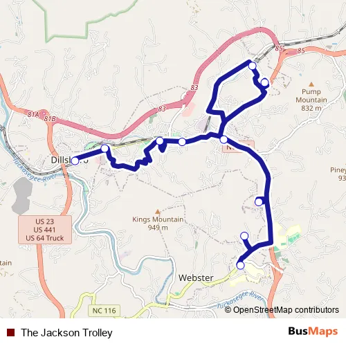 The first stop of the The Jackson Trolley bus route is Dillsboro and the last stop is Southwestern Community College. The Jackson Trolley (The Jackson Trolley) is operational during entre semana.