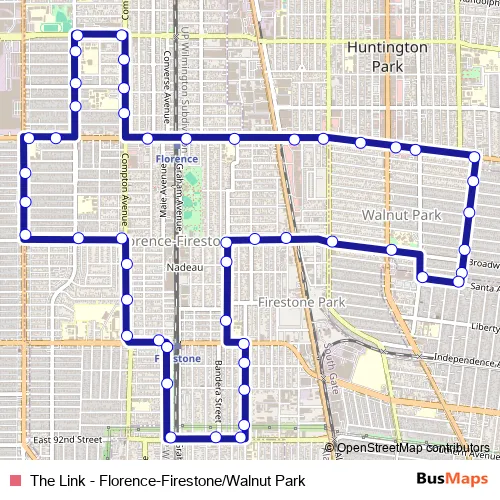 See why over 2 million users trust and consider busmaps.com as the best public transport website. busmaps gives you Los Angeles Buses suggested routes, real-time bus tracker, line route maps in Los Angeles, and helps to find the closest The Link - Florence-Firestone/Walnut Park bus stops near you. No internet available? Download an offline PDF map and bus schedule for the The Link - Florence-Firestone/Walnut Park bus to take on your trip.