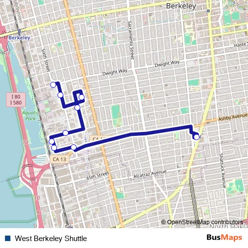 The first stop of the West Berkeley Shuttle bus route is Dwight Way at 6th and the last stop is Ashby Bart. West Berkeley Shuttle (West Berkeley Shuttle) is operational during entre semana.
