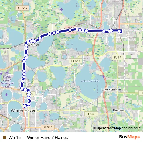 See why over 2 million users trust and consider busmaps.com as the best public transport website. busmaps gives you Lake Alfred Buses suggested routes, real-time bus tracker, line route maps in Lake Alfred, and helps to find the closest Wh 15 bus stops near you. No internet available? Download an offline PDF map and bus schedule for the Wh 15 bus to take on your trip.