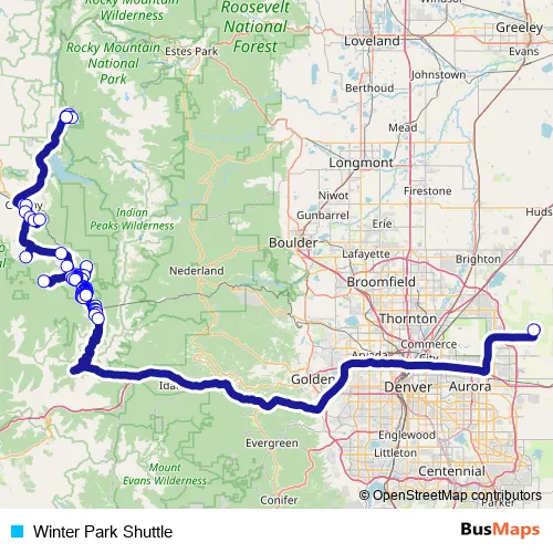 The first stop of the Winter Park Shuttle bus route is Winter Park and the last stop is Denver Airport. Winter Park Shuttle (Winter Park Shuttle) is operational during todos los días.