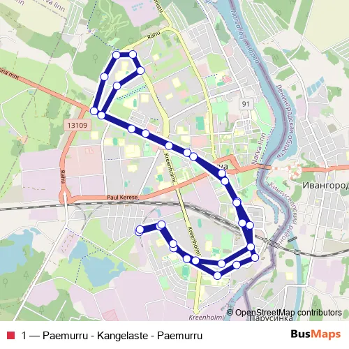The first stop of the 1 bus route is Paemurru and the last stop is Paemurru. 1 (Paemurru - Kangelaste - Paemurru) is operational during iga päev.