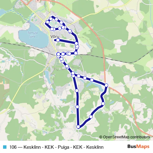 The first stop of the 106 bus route is Kesklinn and the last stop is Kesklinn. 106 (Kesklinn - KEK - Puiga - KEK - Kesklinn) is operational during iga päev.