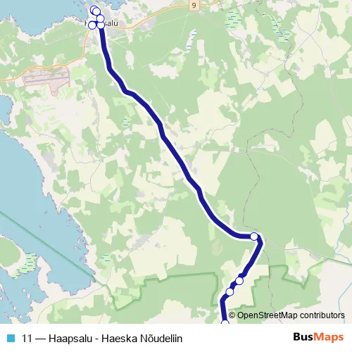 The first stop of the 11 bus route is Haeska and the last stop is Haapsalu bussijaam. 11 (Haapsalu - Haeska Nõudeliin) is operational during nädalavahetustel.