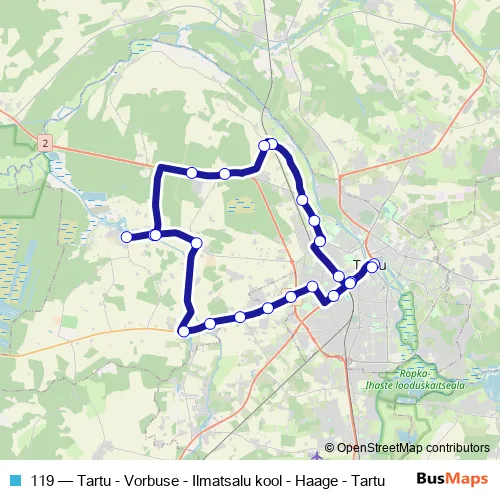 The first stop of the 119 bus route is Tartu bussijaam and the last stop is Soola Ii. 119 (Tartu - Vorbuse - Ilmatsalu kool - Haage - Tartu) is operational during tööpäeviti.