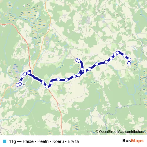 The first stop of the 11g bus route is Ervita and the last stop is Paide bussijaam 6. 11g (Paide - Peetri - Koeru - Ervita) is operational during iga päev.