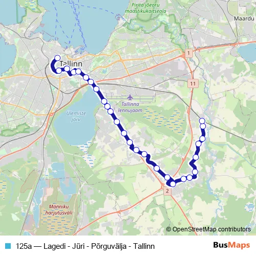 The first stop of the 125a bus route is Balti jaam 1 (train station) and the last stop is Lagedi kauplus. 125a (Lagedi - Jüri - Põrguvälja - Tallinn) is operational during tööpäeviti.
