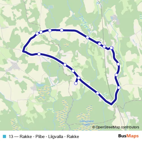The first stop of the 13 bus route is Rakke and the last stop is Rakke. 13 (Rakke - Piibe - Liigvalla - Rakke) is operational during tööpäeviti.