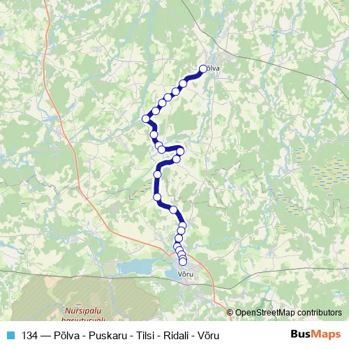The first stop of the 134 bus route is Põlva bussijaam and the last stop is Võru bussijaam. 134 (Põlva - Puskaru - Tilsi - Ridali - Võru) is operational during iga päev.
