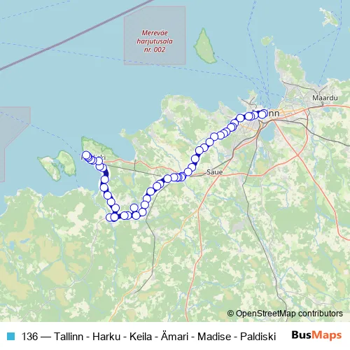 The first stop of the 136 bus route is Viru and the last stop is Sadama. 136 (Tallinn - Harku - Keila - Ämari - Madise - Paldiski) is operational during tööpäeviti.