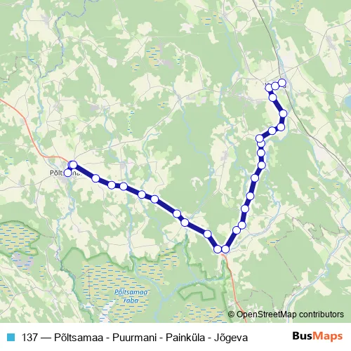 The first stop of the 137 bus route is Põltsamaa and the last stop is Jõgeva. 137 (Põltsamaa - Puurmani - Painküla - Jõgeva) is operational during iga päev.