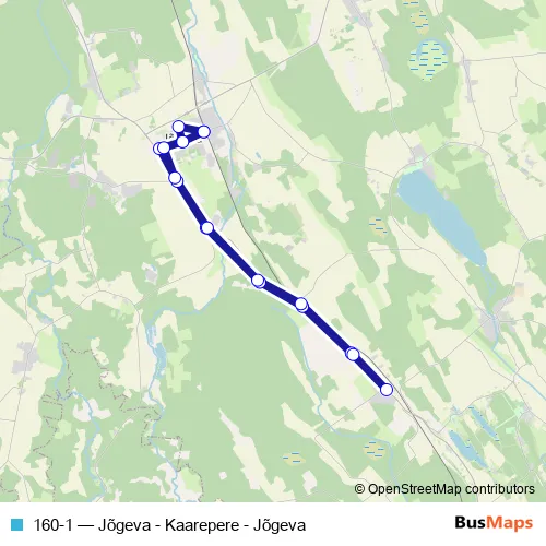 The first stop of the 160-1 bus route is Jõgeva and the last stop is Jõgeva. 160-1 (Jõgeva - Kaarepere - Jõgeva) is operational during tööpäeviti.