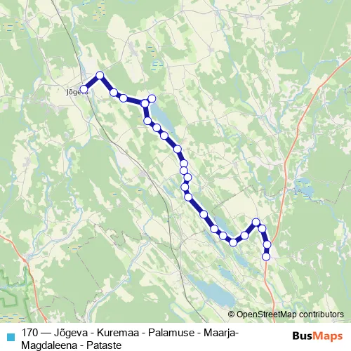 The first stop of the 170 bus route is Jõgeva and the last stop is Pataste. 170 (Jõgeva - Kuremaa - Palamuse - Maarja-Magdaleena - Pataste) is operational during tööpäeviti.