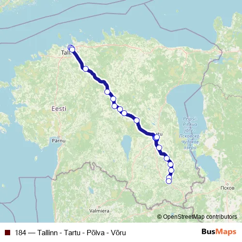 The first stop of the 184 bus route is Tallinna bussijaam and the last stop is Võru bussijaam. 184 (Tallinn - Tartu - Põlva - Võru) is operational during iga päev.