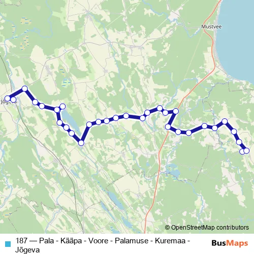 The first stop of the 187 bus route is Pala and the last stop is Jõgeva. 187 (Pala - Kääpa - Voore - Palamuse - Kuremaa - Jõgeva) is operational during tööpäeviti.