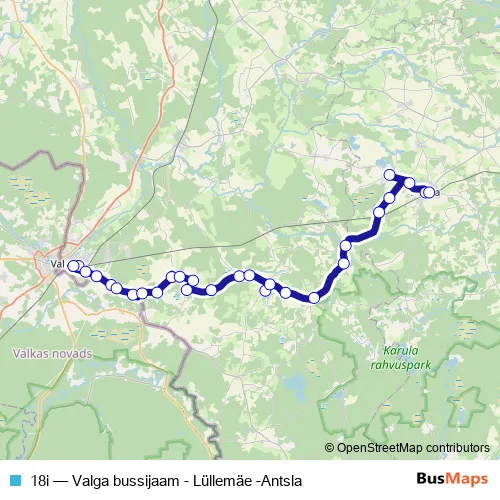The first stop of the 18i bus route is Valga bussijaam and the last stop is Antsla. 18i (Valga bussijaam - Lüllemäe -Antsla) is operational during iga päev.