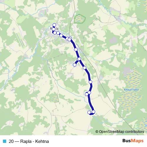 The first stop of the 20 bus route is Rapla bussijaam and the last stop is Kalbu. 20 (Rapla - Kehtna) is operational during iga päev.