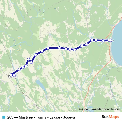 The first stop of the 205 bus route is Mustvee and the last stop is Jõgeva. 205 (Mustvee - Torma - Laiuse - Jõgeva) is operational during tööpäeviti.