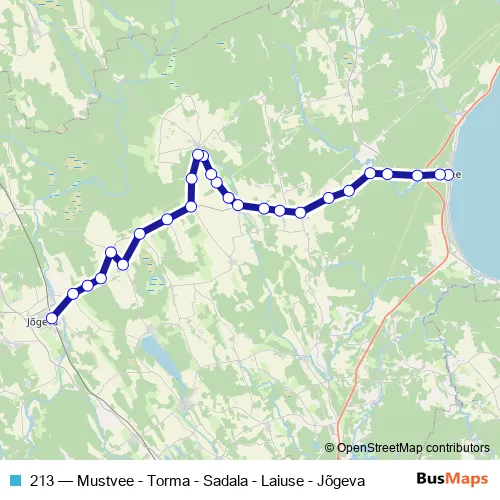 The first stop of the 213 bus route is Mustvee and the last stop is Jõgeva. 213 (Mustvee - Torma - Sadala - Laiuse - Jõgeva) is operational during iga päev.