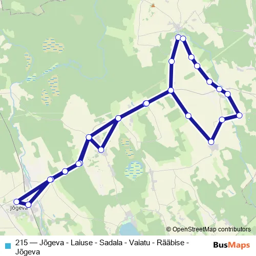 The first stop of the 215 bus route is Jõgeva and the last stop is Jõgeva. 215 (Jõgeva - Laiuse - Sadala - Vaiatu - Rääbise - Jõgeva) is operational during tööpäeviti.