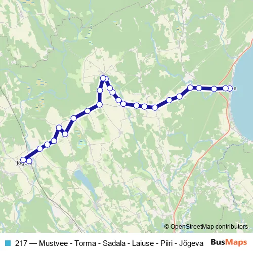 The first stop of the 217 bus route is Mustvee and the last stop is Jõgeva. 217 (Mustvee - Torma - Sadala - Laiuse - Piiri - Jõgeva) is operational during tööpäeviti.