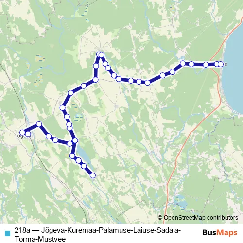 The first stop of the 218a bus route is Jõgeva and the last stop is Mustvee. 218a (Jõgeva-Kuremaa-Palamuse-Laiuse-Sadala-Torma-Mustvee) is operational during tööpäeviti.