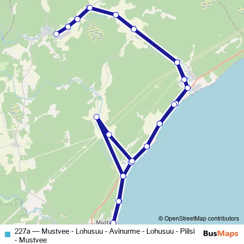The first stop of the 227a bus route is Mustvee and the last stop is Mustvee. 227a (Mustvee - Lohusuu - Avinurme - Lohusuu - Piilsi - Mustvee) is operational during tööpäeviti.