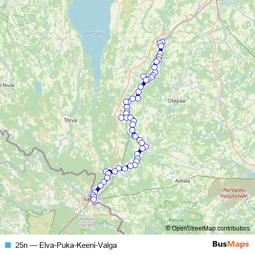 The first stop of the 25n bus route is Elva and the last stop is Valga bussijaam. 25n (Elva-Puka-Keeni-Valga) is operational during iga päev.