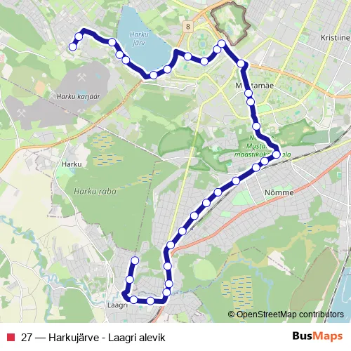 The first stop of the 27 bus route is Oja tee and the last stop is Laaniku. 27 (Harkujärve - Laagri alevik) is operational during iga päev.