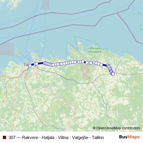 The first stop of the 307 bus route is Tallinna bussijaam and the last stop is Rakvere bussijaam. 307 (Rakvere - Haljala - Viitna - Valgejõe - Tallinn) is operational during iga päev.