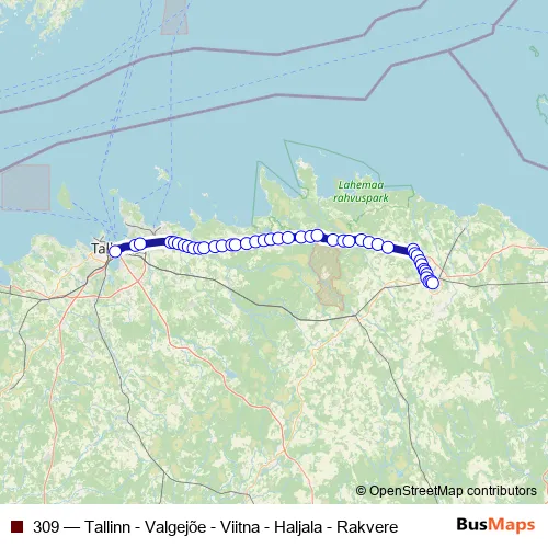 The first stop of the 309 bus route is Tallinna bussijaam and the last stop is Rakvere bussijaam. 309 (Tallinn - Valgejõe - Viitna - Haljala - Rakvere) is operational during iga päev.