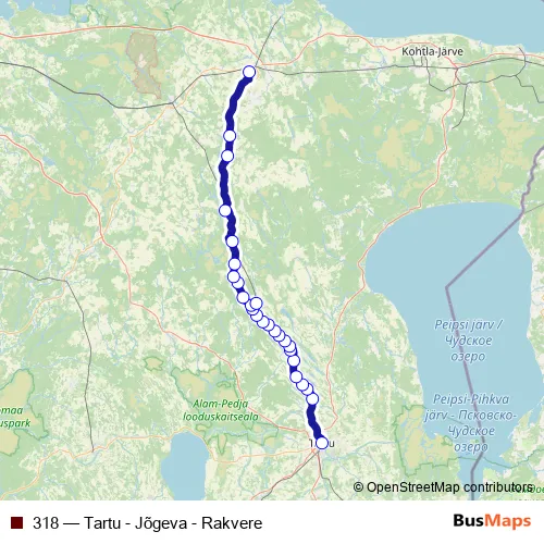 The first stop of the 318 bus route is Tartu bussijaam and the last stop is Rakvere bussijaam. 318 (Tartu - Jõgeva - Rakvere) is operational during iga päev.