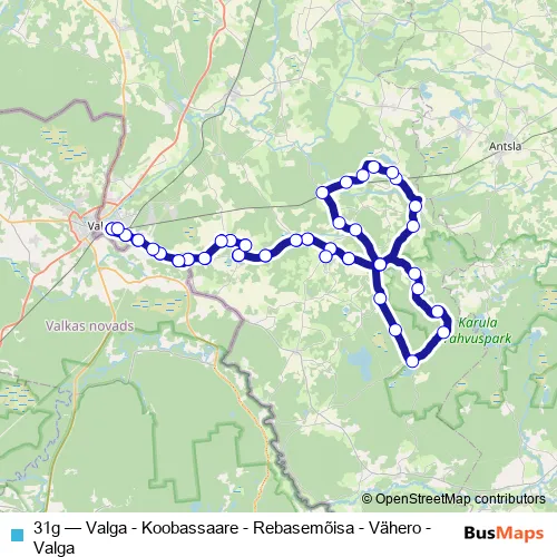 The first stop of the 31g bus route is Valga bussijaam and the last stop is Valga bussijaam. 31g (Valga - Koobassaare - Rebasemõisa - Vähero - Valga) is operational during iga päev.