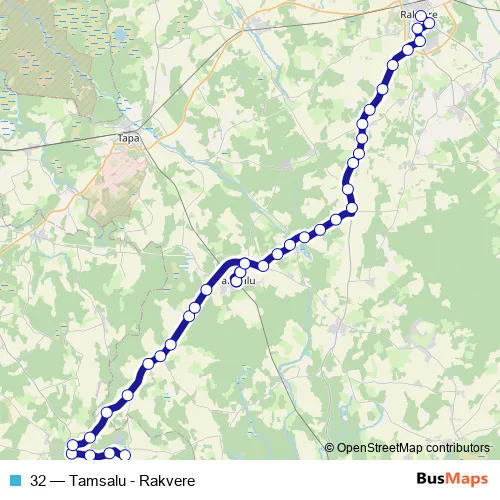 The first stop of the 32 bus route is Järva-Jaani and the last stop is Rakvere bussijaam. 32 (Tamsalu - Rakvere) is operational during iga päev.