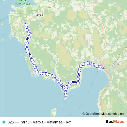 The first stop of the 326 bus route is Pärnu bussijaam and the last stop is Kotiristi. 326 (Pärnu - Varbla - Vatlamäe - Koti) is operational during iga päev.