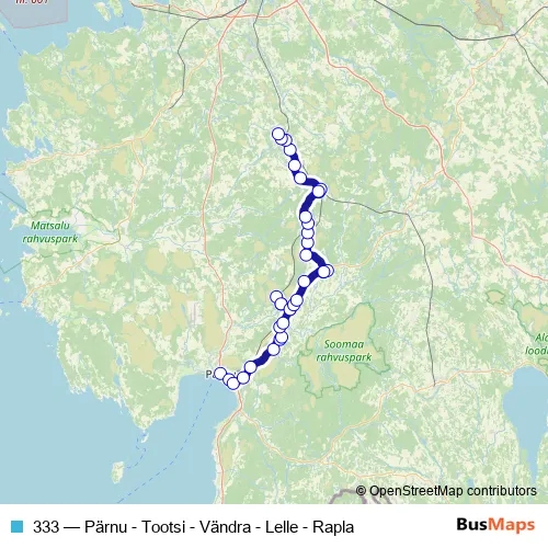 The first stop of the 333 bus route is Pärnu bussijaam and the last stop is Rapla bussijaam. 333 (Pärnu - Tootsi - Vändra - Lelle - Rapla) is operational during iga päev.