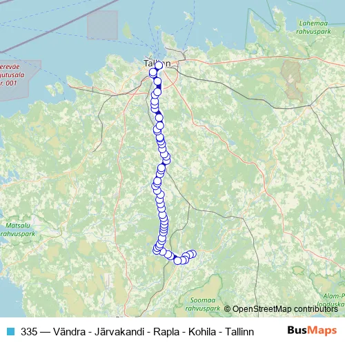 The first stop of the 335 bus route is Vändra and the last stop is Tallinna bussijaam. 335 (Vändra - Järvakandi - Rapla - Kohila - Tallinn) is operational during iga päev.