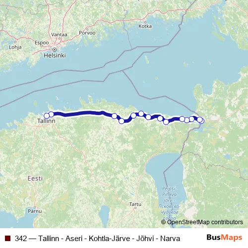 The first stop of the 342 bus route is Narva and the last stop is Tallinna bussijaam. 342 (Tallinn - Aseri - Kohtla-Järve - Jõhvi - Narva) is operational during iga päev.