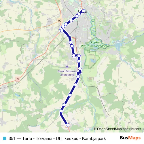 The first stop of the 351 bus route is Tartu bussijaam and the last stop is Kambja park. 351 (Tartu - Tõrvandi - Uhti keskus - Kambja park) is operational during iga päev.