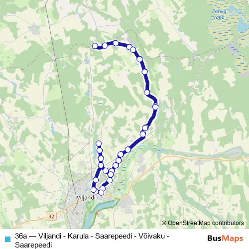 The first stop of the 36a bus route is Viljandi bussijaam and the last stop is Uku. 36a (Viljandi - Karula - Saarepeedi - Võivaku - Saarepeedi) is operational during iga päev.