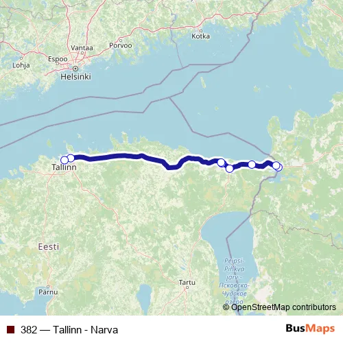 The first stop of the 382 bus route is Narva and the last stop is Tallinna bussijaam. 382 (Tallinn - Narva) is operational during iga päev.