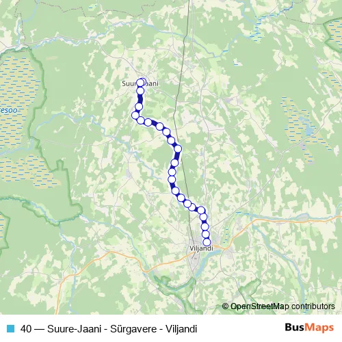 The first stop of the 40 bus route is Viljandi bussijaam and the last stop is Suure-Jaani. 40 (Suure-Jaani - Sürgavere - Viljandi) is operational during iga päev.