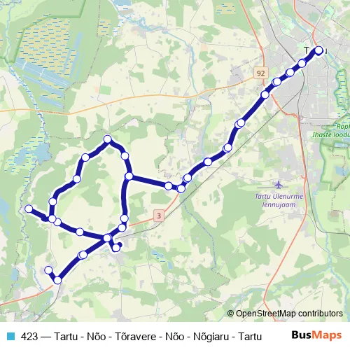 The first stop of the 423 bus route is Tartu bussijaam and the last stop is Tartu bussijaam. 423 (Tartu - Nõo - Tõravere - Nõo - Nõgiaru - Tartu) is operational during tööpäeviti.