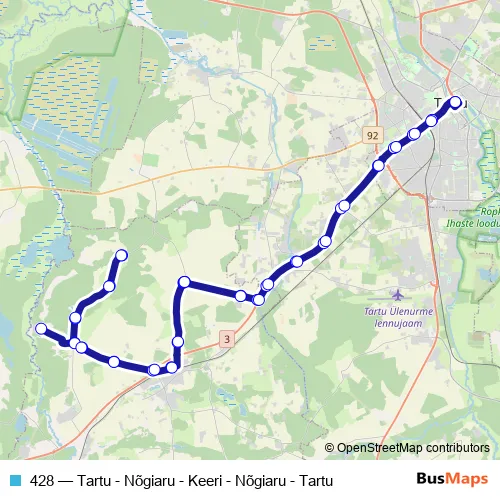 The first stop of the 428 bus route is Tartu bussijaam and the last stop is Tartu bussijaam. 428 (Tartu - Nõgiaru - Keeri - Nõgiaru - Tartu) is operational during tööpäeviti.
