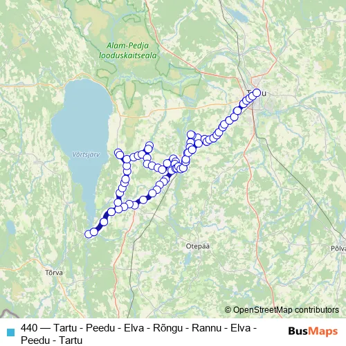 The first stop of the 440 bus route is Tartu bussijaam and the last stop is Tartu bussijaam. 440 (Tartu - Peedu - Elva - Rõngu - Rannu - Elva - Peedu - Tartu) is operational during iga päev.