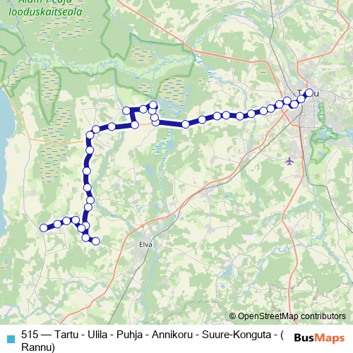 The first stop of the 515 bus route is Tartu bussijaam and the last stop is Rannu. 515 (Tartu - Ulila - Puhja - Annikoru - Suure-Konguta - (Rannu)) is operational during tööpäeviti.